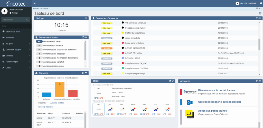 Interface Intranet employé pour chaque agent, portail responsable pour les managers, espace dédié DRH, avec droits finement paramétrés selon les profils et les services .