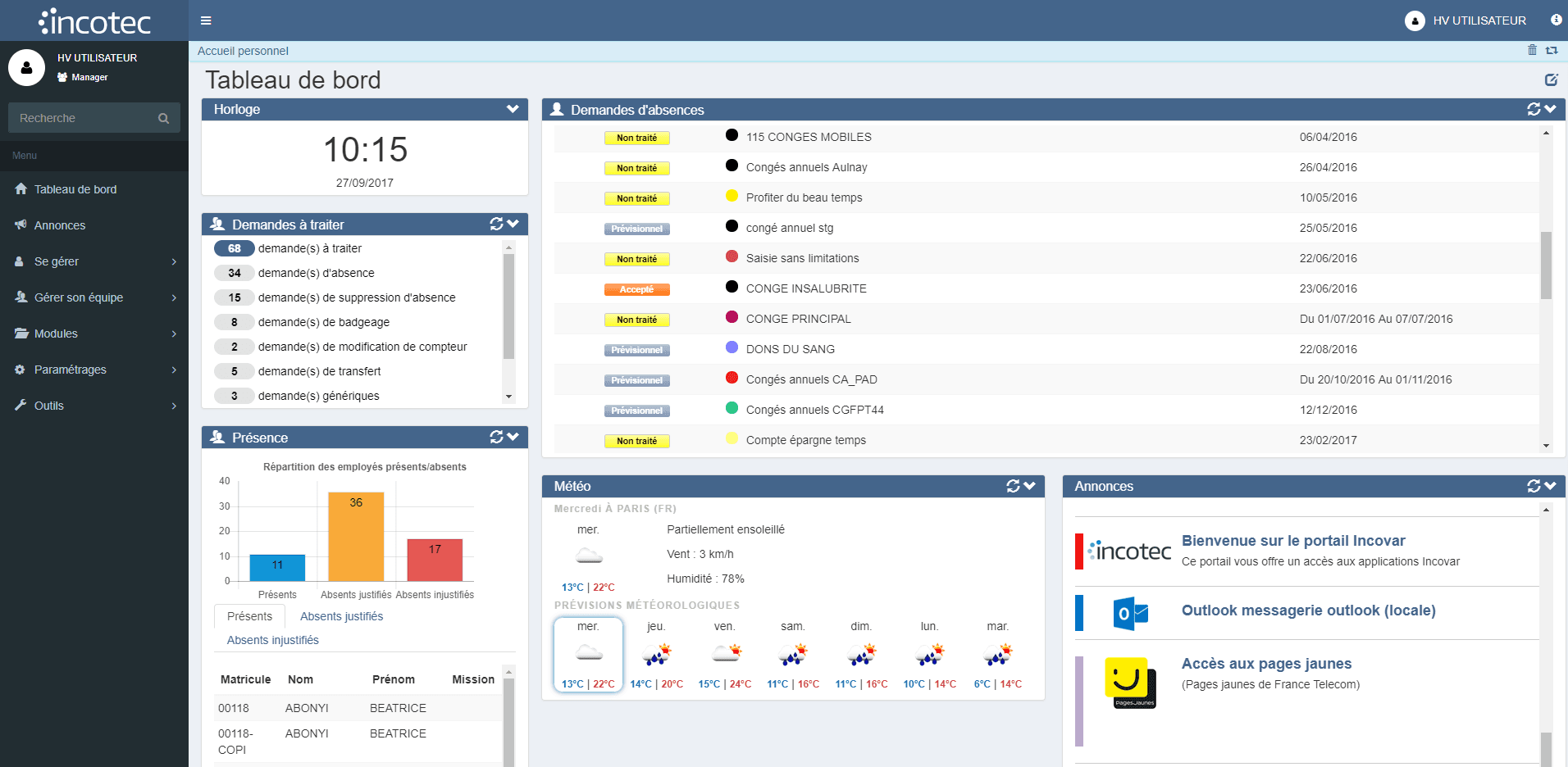 Interface Intranet employé pour chaque agent, portail responsable pour les managers, espace dédié DRH, avec droits finement paramétrés selon les profils et les services .